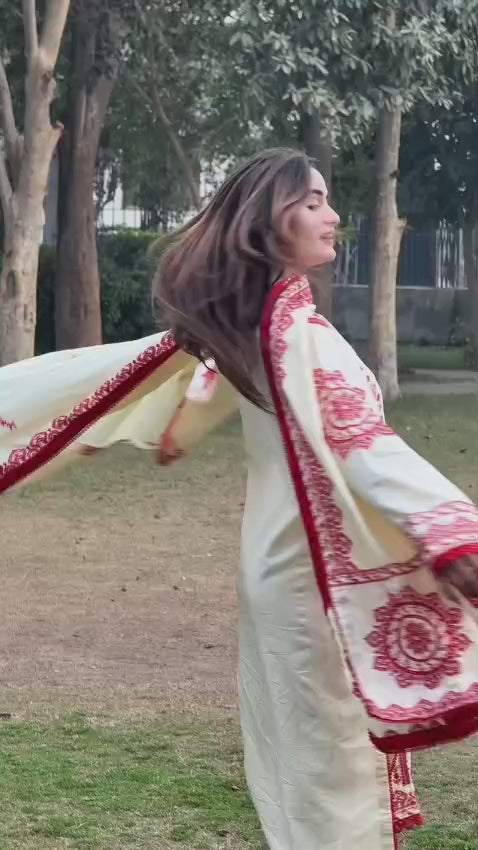 Dhaga Embroidery 3PC Suit | Heavy Embroidered Shawl | Stone Linen Brand Fabric | Embroidery Dress For Girl's