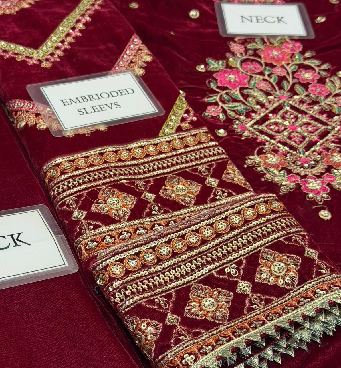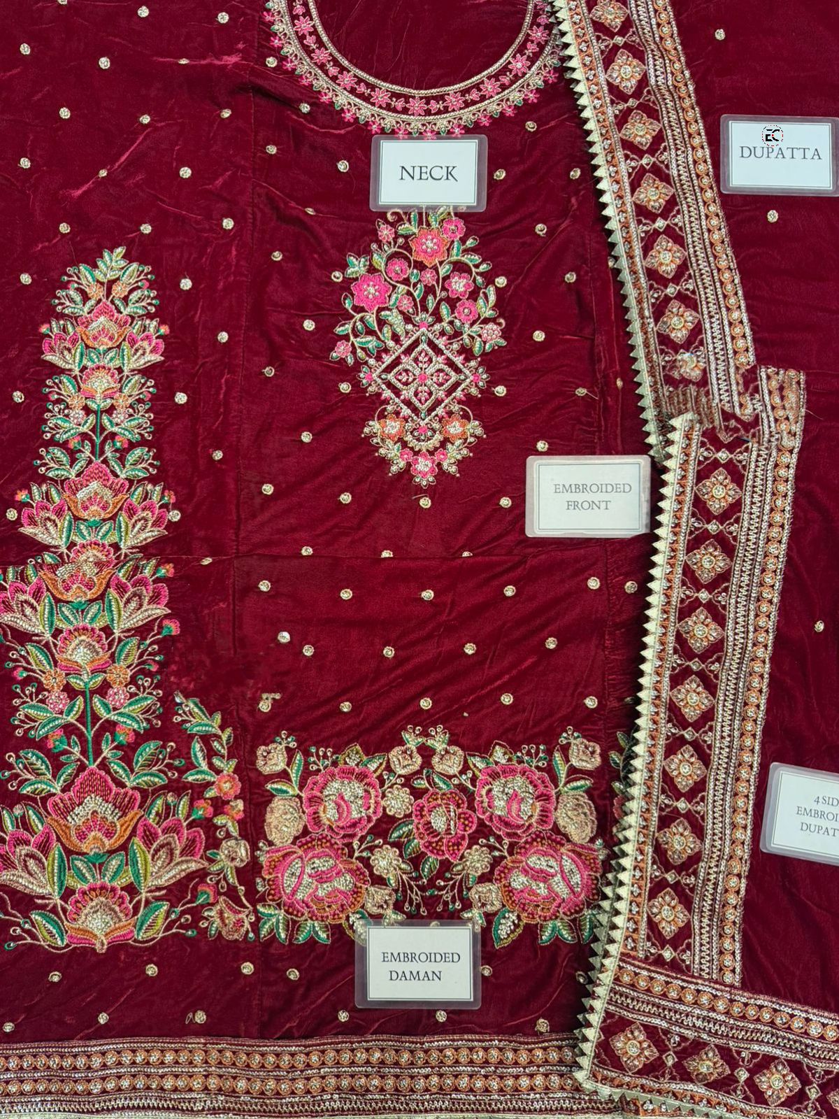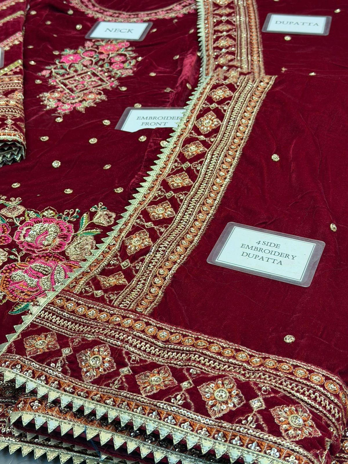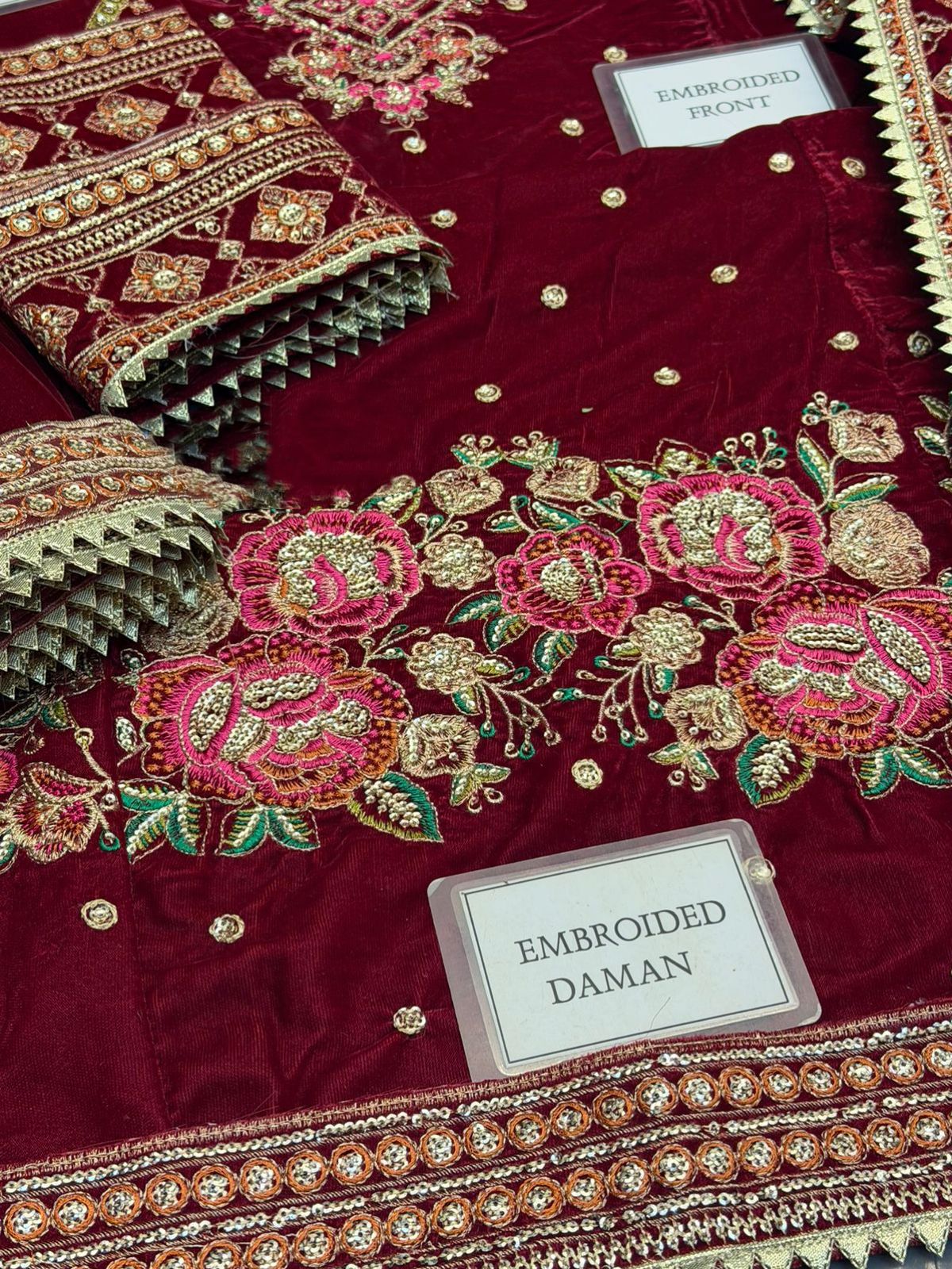 *VELVET fully heavy embroidered spengle work centre panel front with fully embroidered spengle work left & right panel attach with embroidered spengle work daman boarder with fancy lace attach with embroidered spengle work chak lace with fancy lace attach*
